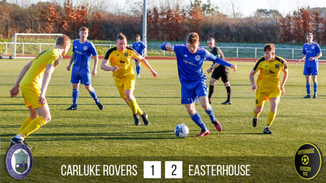Only a minute later Easterhouse were to take the lead. A corner came in from the left and what looked liked like an innocuous looping header over the bar dipped underneath it and into the goal. It had looked to be going over and so caught out Josh McGill in the Carluke goal. 0-1 to Easterhouse. This goal gave Easterhouse a huge lift and it didn’t take long for them to double their lead when again from another corner. This time it came in from the right, fired in low and Easterhouse No 8 nicked in front of the Rovers defender to glance a header in at the near post. 0-2 to Easterhouse.