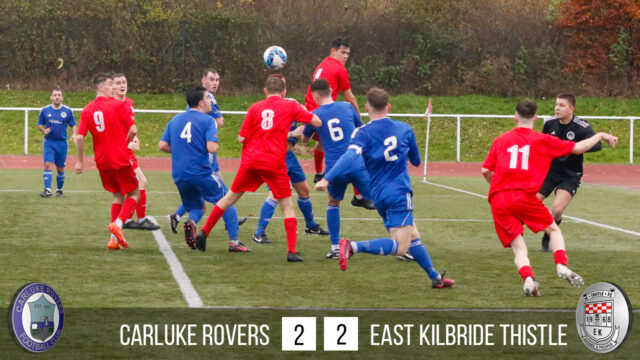 Carluke were to rue those missed chances when in the last minute of the game East Kilbride got a corner on the right hand side which they took short. Instead of knocking the ball back the East Kilbride player turned inside and ran along the bye line. He cut it back to the edge of the six yard box to one of his players’ who calmy stroked the ball home. 2-2. This was to be the last of the action and the Carluke Rovers trudged off the pitch despondent knowing this was a game they should have won. Final Score Carluke Rovers 2 East Kilbride Thistle 2.