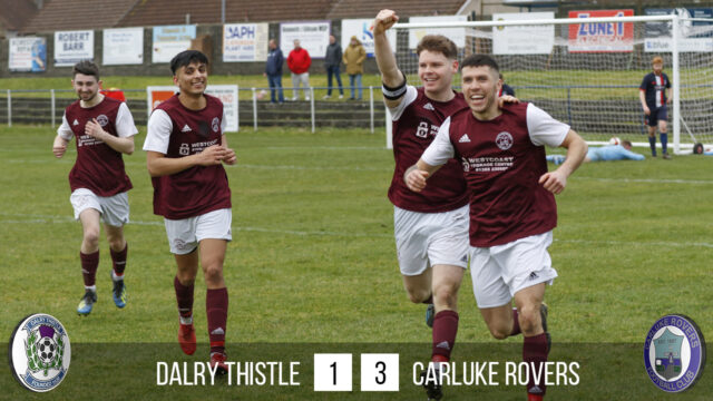 All in all a deserved victory for Carluke Rovers and a further boost to the confidence of the players. Next week it is another away day to Dumbarton this time and Vale of Leven. This is an opportunity for Carluke to win three on the bounce and gain further momentum as they work towards securing their status in the Division next season. Final score Dalry Thistle 1 Carluke Rovers 3.