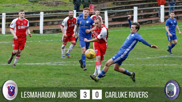 The scoreline flattered Lesmahagow as the game was a fairly even affair particularly in the second half and to Carluke’s credit they kept looking for an opening. It nearly came in the 80th minute when a shot by Christy Lawlor was parried away for a corner by the Lesmahagow goalkeeper.