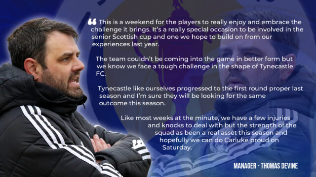 Like most weeks at the minute, we have a few injuries and knocks to deal with but the strength of the squad has been a real asset this season and hopefully we can do Carluke proud on Saturday.