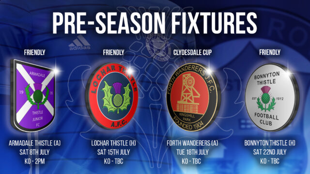 Saturday 8th July sees our first Pre-Season friendly with a trip to face EOSFL side Armadale Thistle at Volunteer Park. Kick Off 2pm.