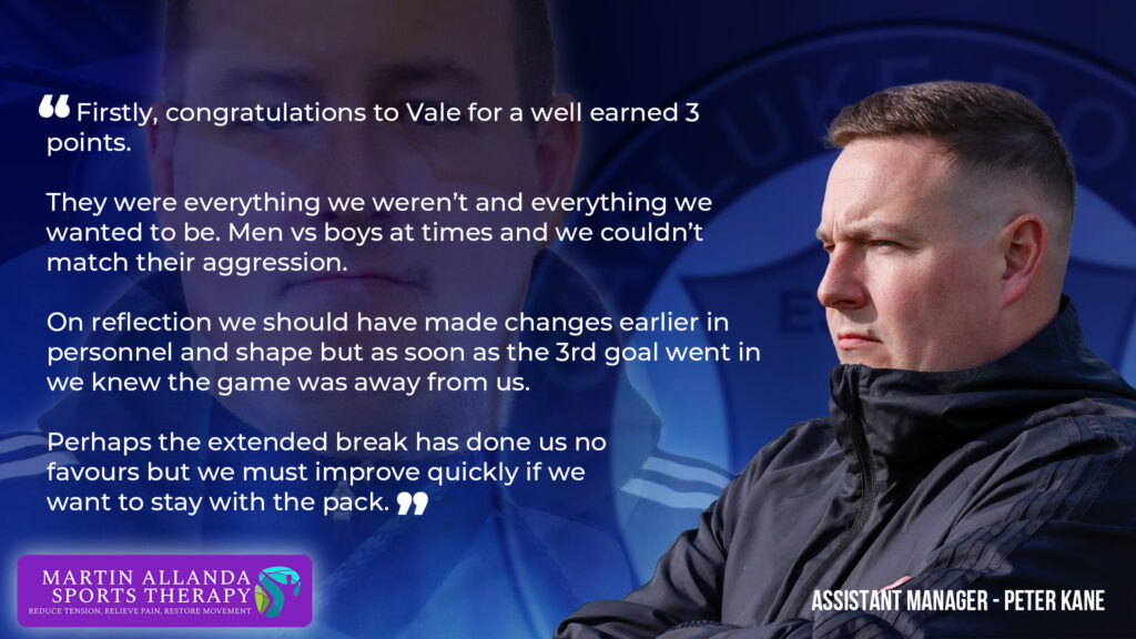 The hosts opened the scoring after just 10 minutes when Stuart Alexander’s effort from inside the box squirmed under Eoin Wallace in the Carluke goal. It set the tone for a difficult afternoon for Rovers, who struggled to gain any foothold in the game as Vale dominated possession and territory.
