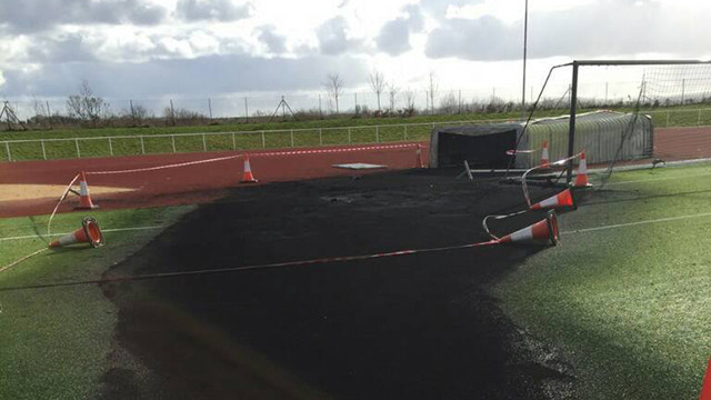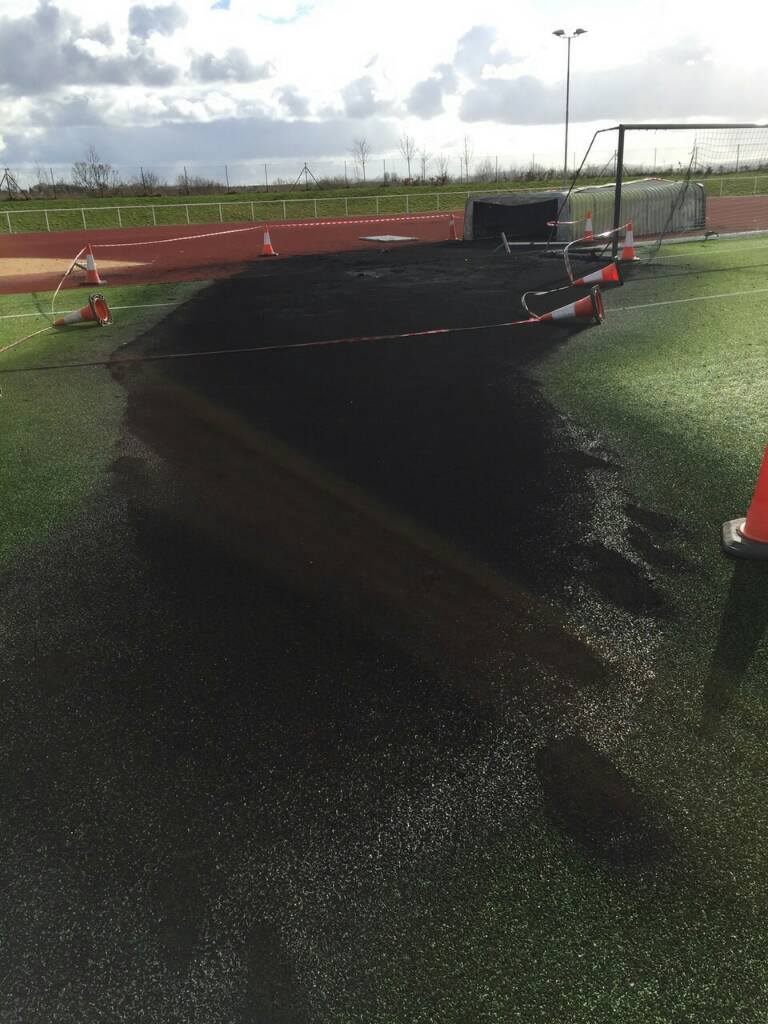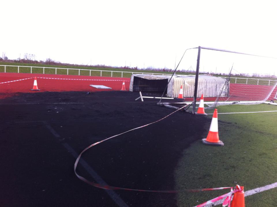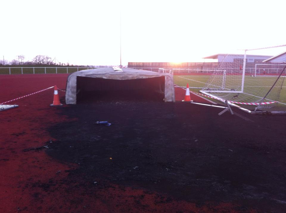 A disgusting act of vandalism and fire raising has seen horrendous damage to the pitch and high jump area at the John Cumming Stadium. The fire was started in the storage container holding the matting for the athletic high jump. The fire quickly spread due to the wind and reached the pitch where it not only damaged the goals and netting it continued over the 18 yard box until it was eventually extinguished.